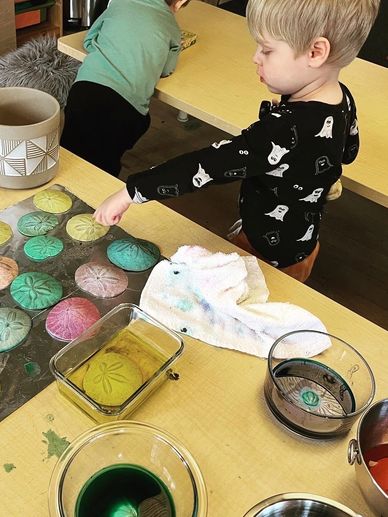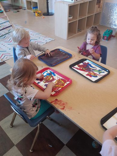 The focus of the Hollow is to create an environment of learning through play. We encourage social and emotional connections within our room. We enjoy activities that challenge and promote self-esteem. You'll find us creating with clay, coloring with different mediums, and getting messy. We dance and sing, using movement to have fun. While our kiddos progress in class, we work with their families on potty training and gaining confidence to move to our preschool rooms.